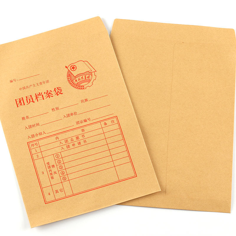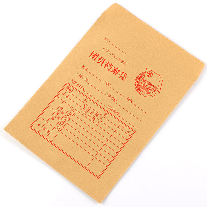 The new version of the Communist Youth League member file bag regulations A4 kraft paper thickens and hardens the special information bag for students entering the league at the beginning of the Senior high school. 50 bags are packed with a set of custom-made member supplies.