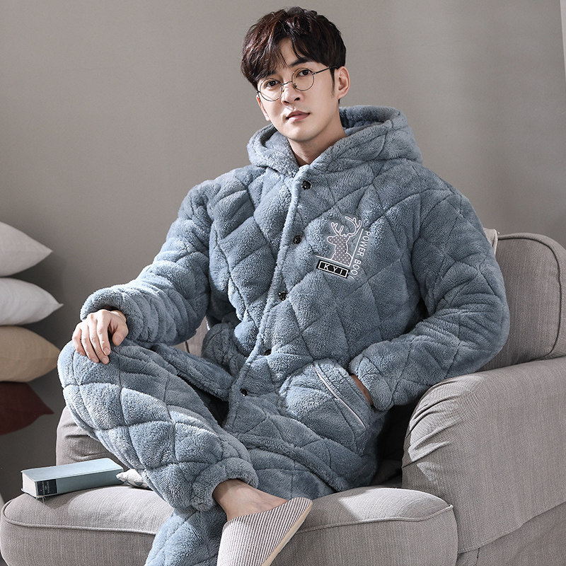 Pajamas for men's autumn and winter plus thick layers of laminated cotton padded jacket ultra-thick and warm suit winter big code cardio-hoodie-Taobao