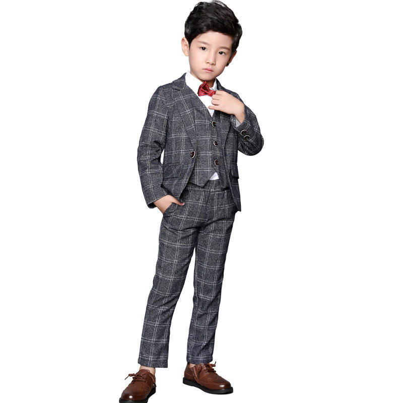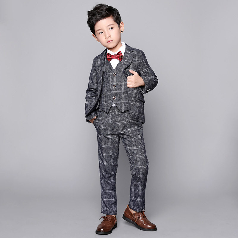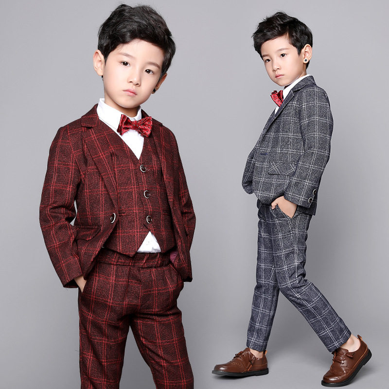 Red three-piece set (box tie) grey three-piece set (bowl tie) white shirt (boot knot)