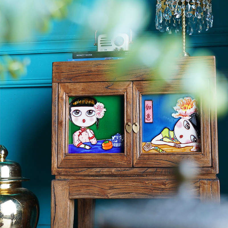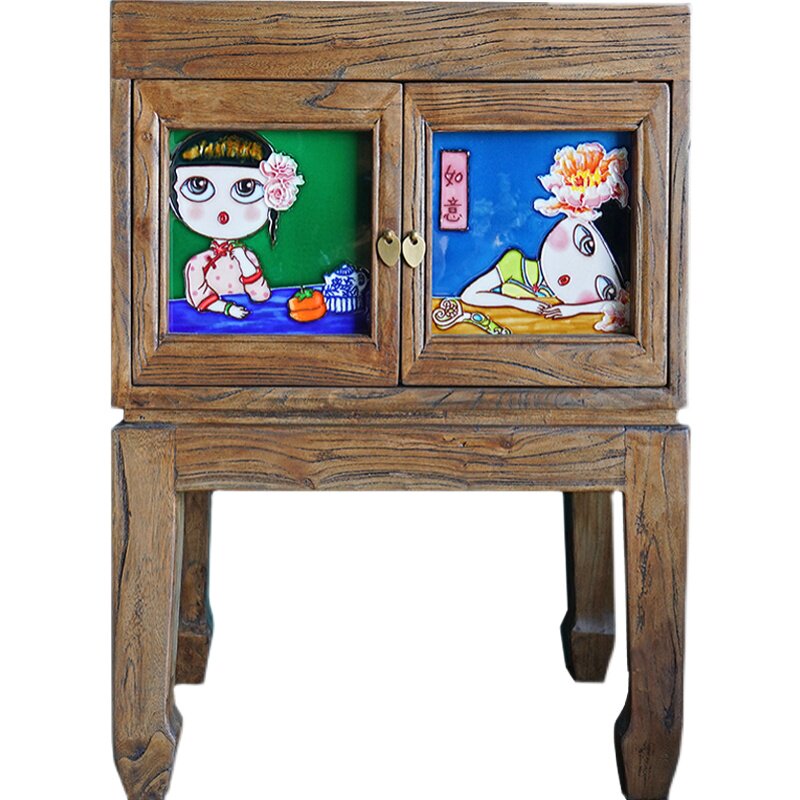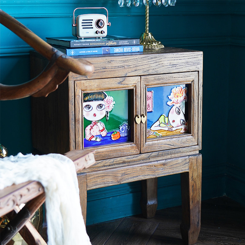 Chinese style retro solid wood bed head cabinet small multifunctional storage containing cabinet ceramic inlaid elm wood-in-the-door cabinet edge cabinet