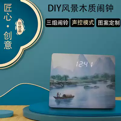 ins creative alarm clock students with DIY landscape painting electronic clock children Boy bedroom bedside wooden clock New