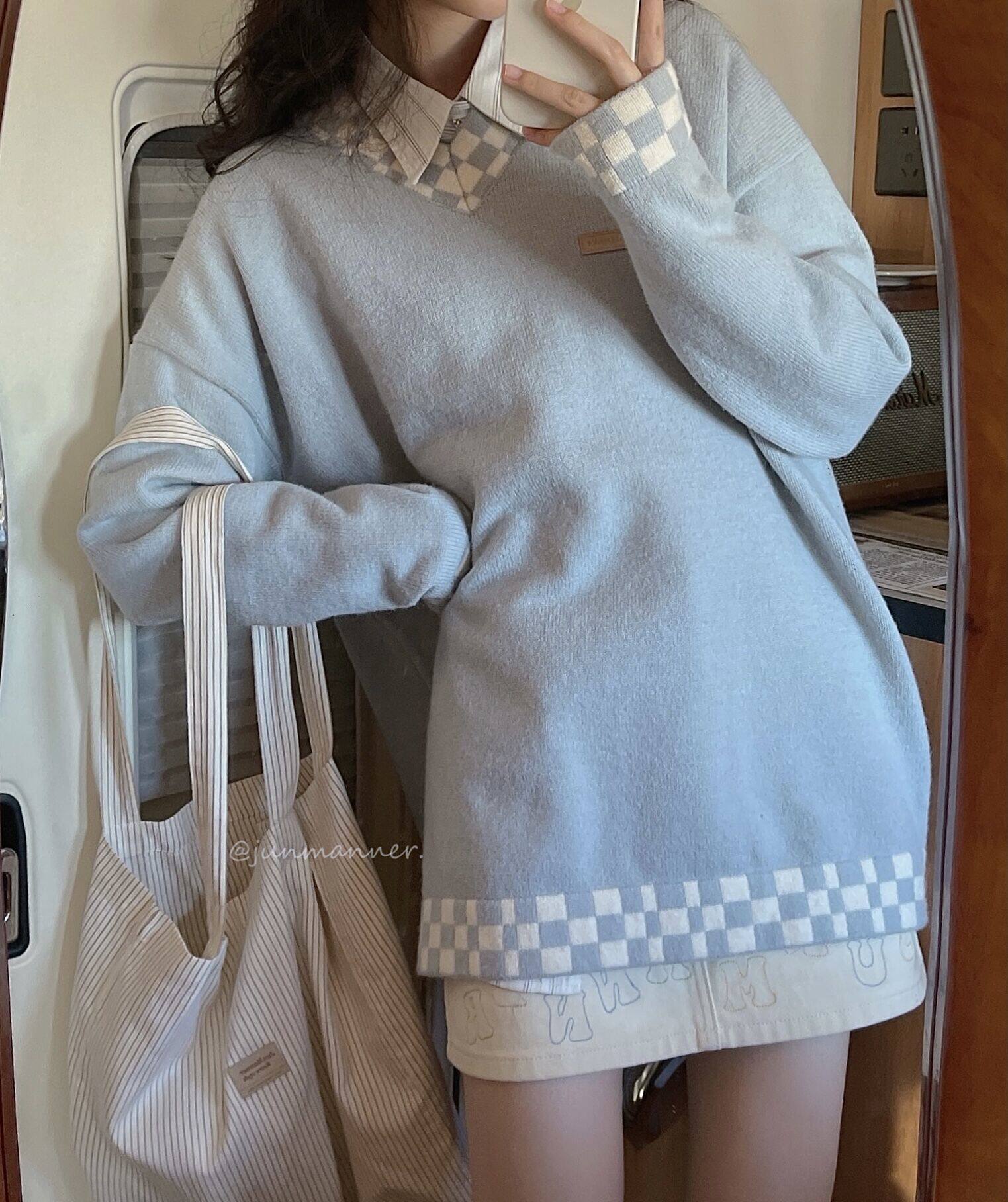 JMWomen Stitching Pullover V-neck Sweater Women Autumn Japanese Loose Lazy Niche Design Sense Sweater Top