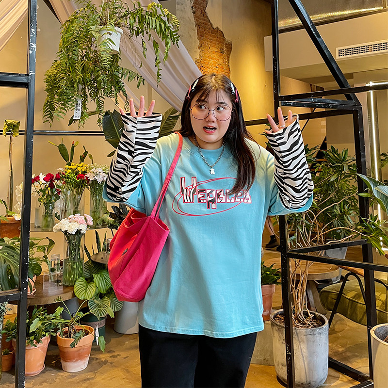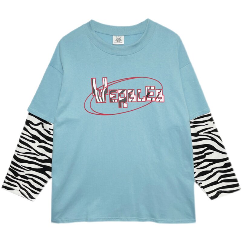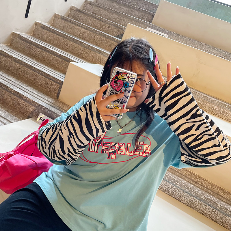 YUZI Caviar's autumn new fat mm stitching long-sleeved round neck T-shirt women's large size zebra print fake two-piece top