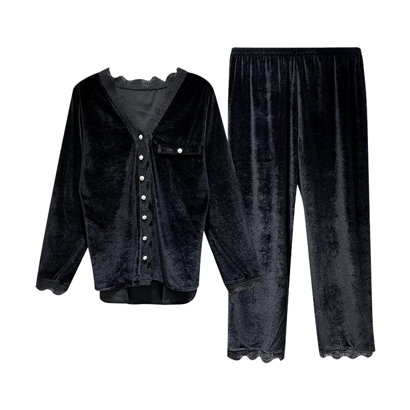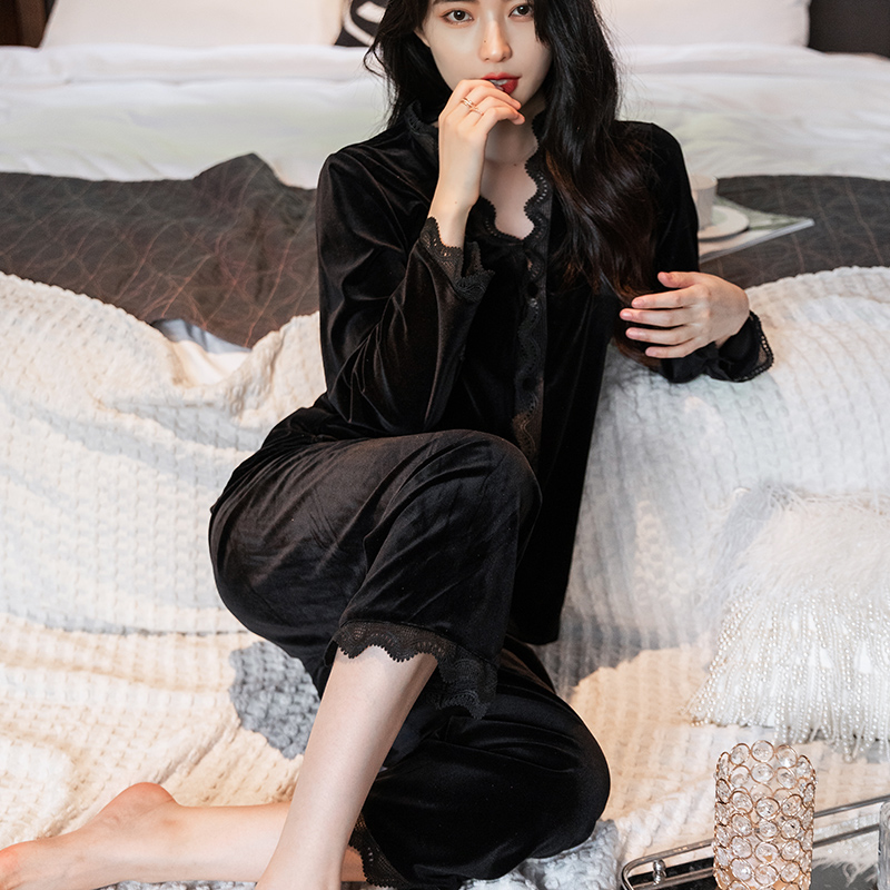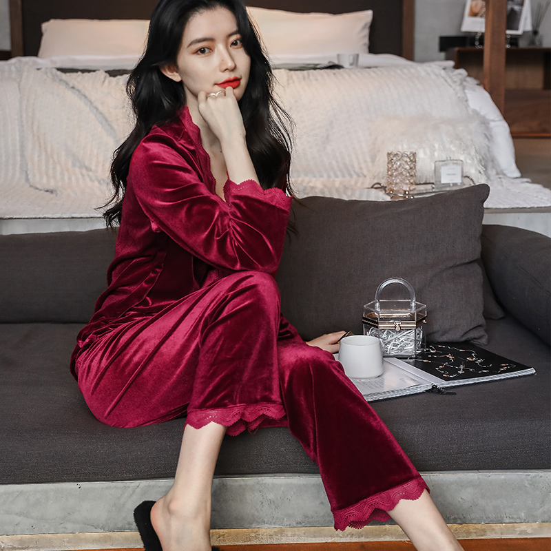Gold velvet pajamas women's autumn and winter loose cardigan warm suit sexy trousers long-sleeved home service two-piece set