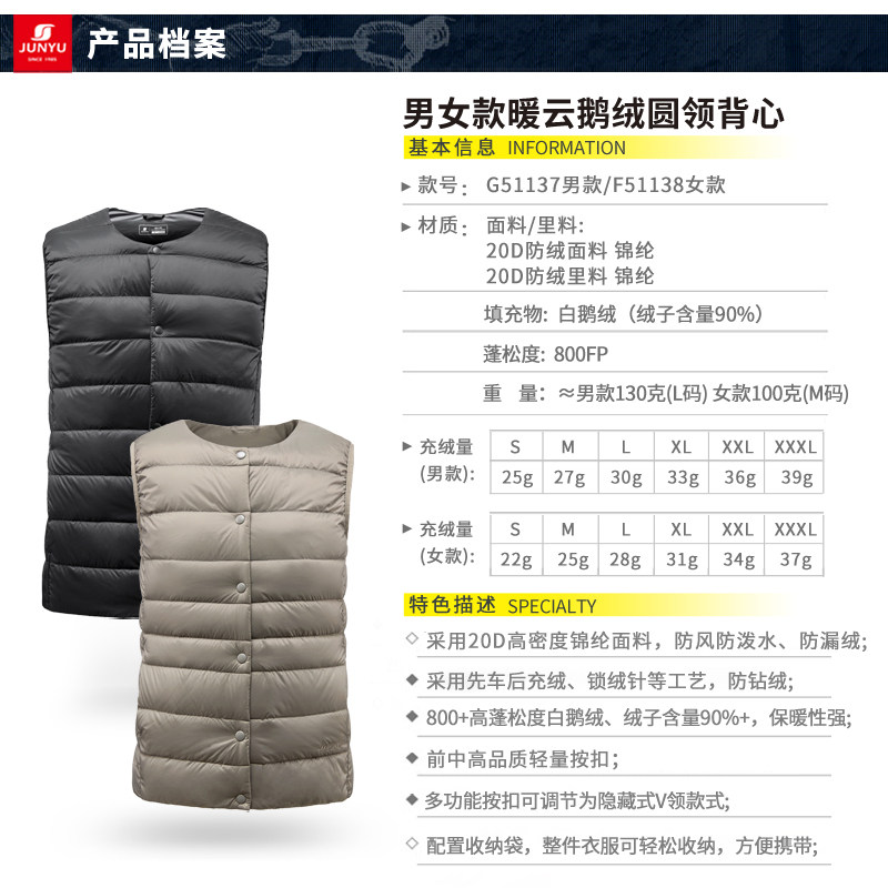 Junyu outdoor goose down vest female round neck light autumn and winter white goose down 800 poncho down vest liner G51137