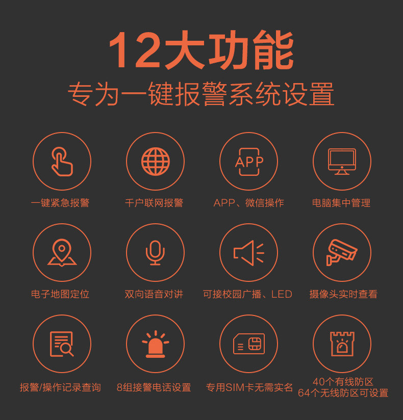 Section A 〖Mobile Card Edition〗 One-click Alarm Host Section B 〖Full Netcom Edition〗One-click Alarm Host Section C 〖Mobile Card Edition〗Four-key Alarm Host Section D 〖Full Netcom Edition〗Four-key Alarm Host Emergency Key E Section E "Full Netcom Internet of Things" Alarm Host
