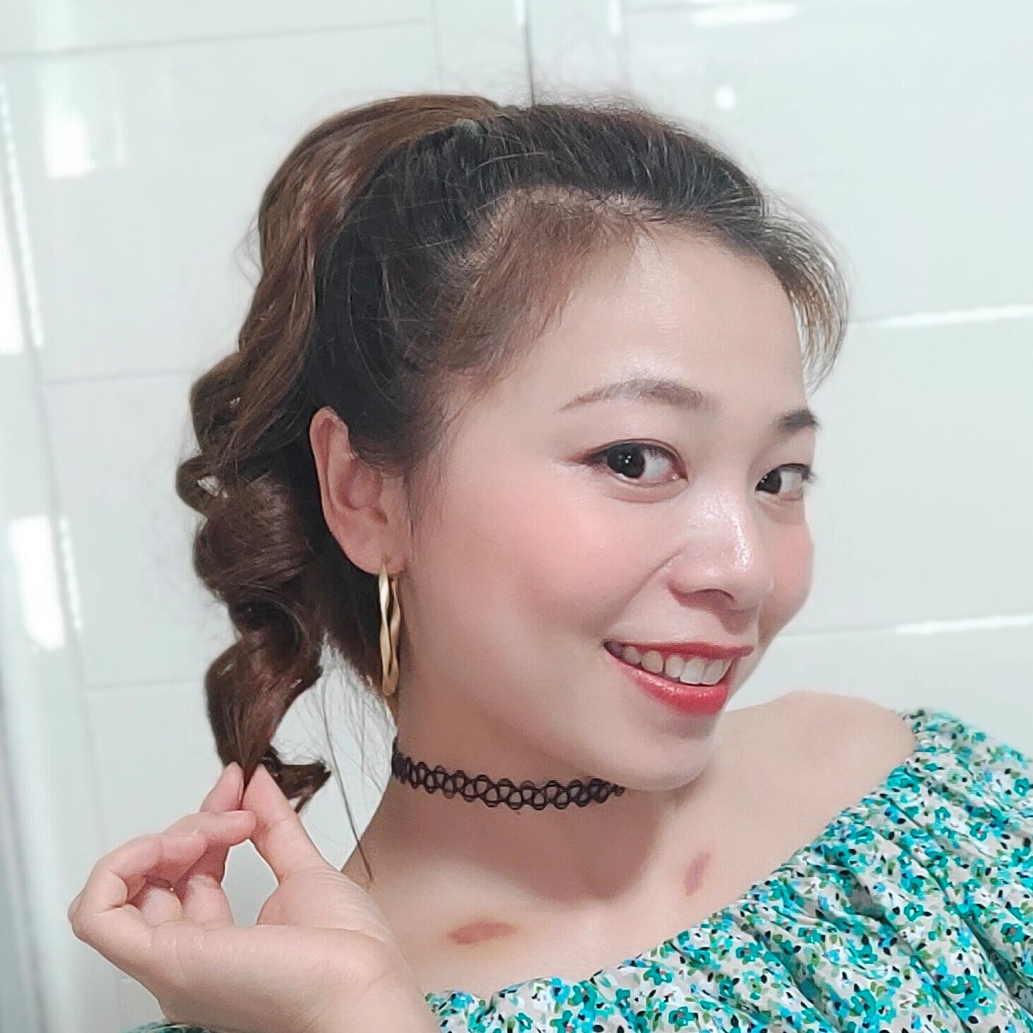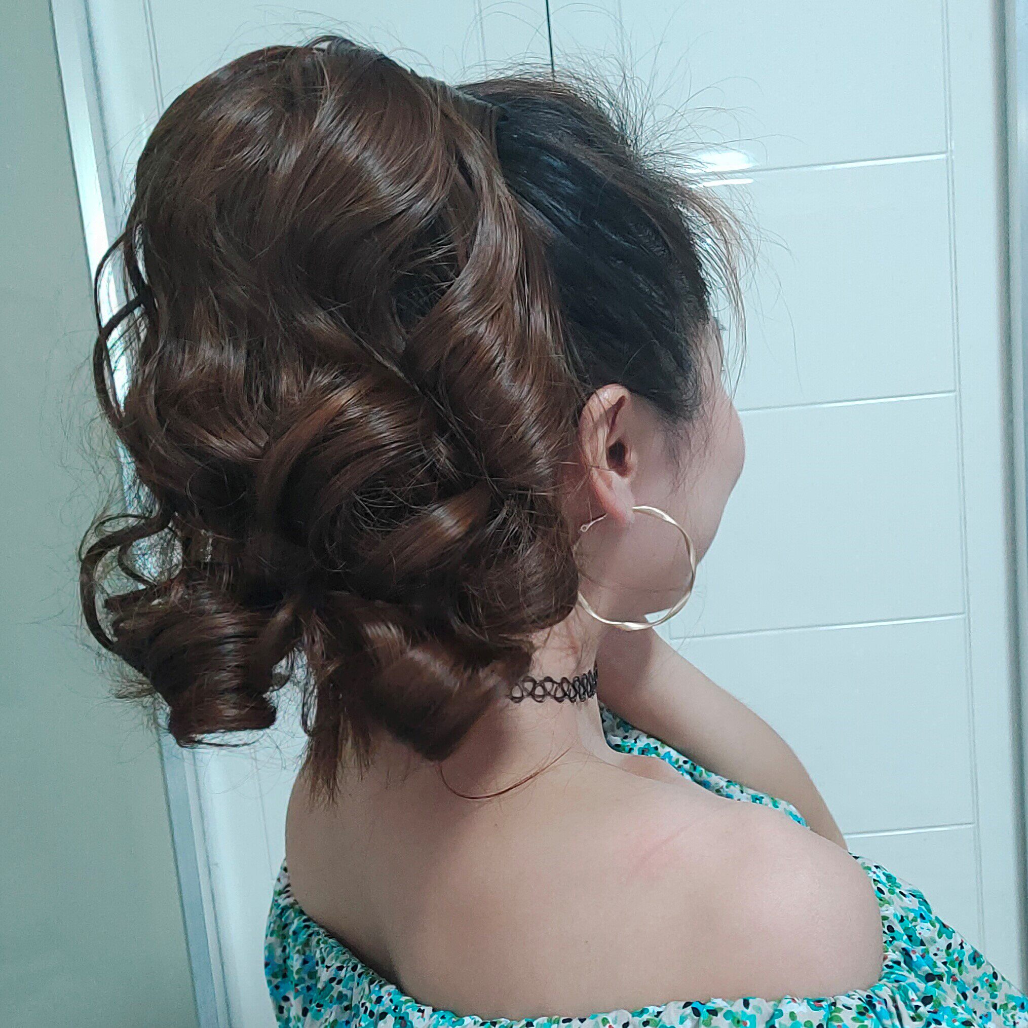 The curly hair of the ponytail