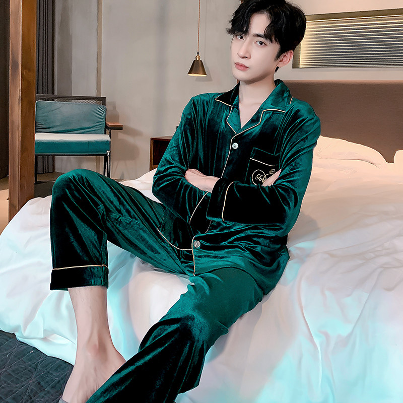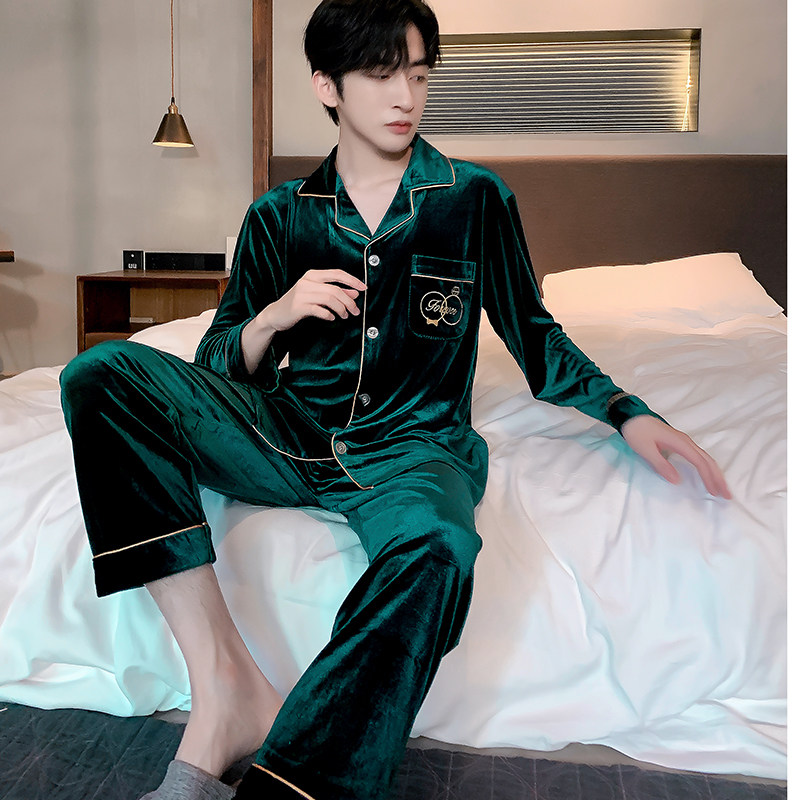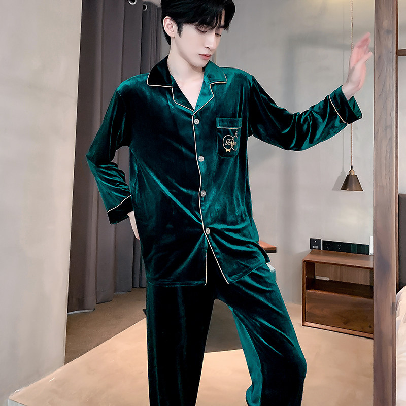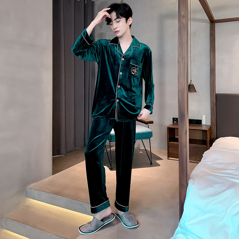 Gold velvet pyjamas for men's autumn and winter Korean version of thin suede spring with long sleeves cardiovert suit big size can be worn outside the home clothes
