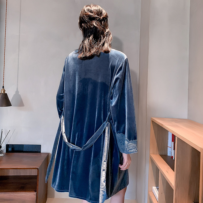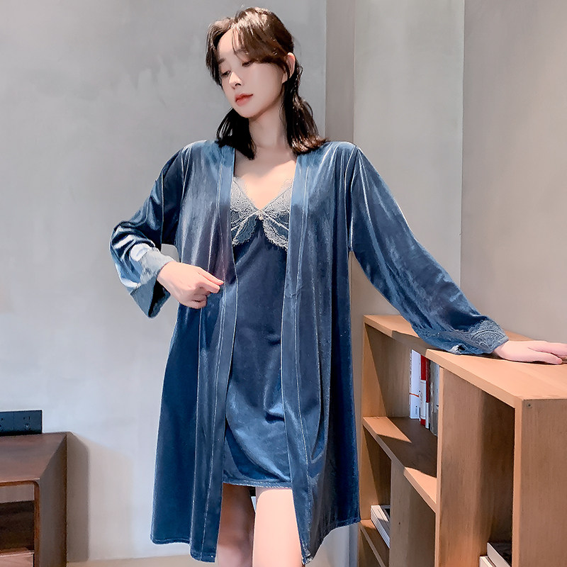 New Ladies Gold Velvet Pajamas Long Sleeve Sexy Sling Robe Lace Bathrobe Set Casual Loose Homewear