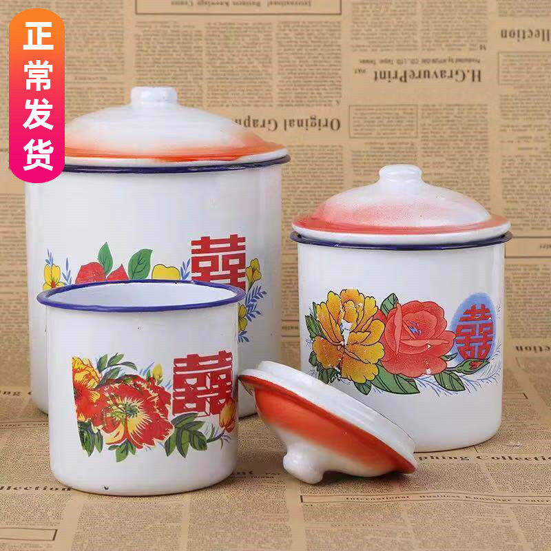 Classic nostalgic enamel cup iron tea cylinder with lid large office hotel old-fashioned double happiness wedding with flower water cup