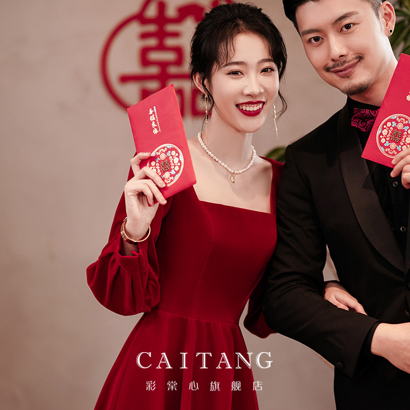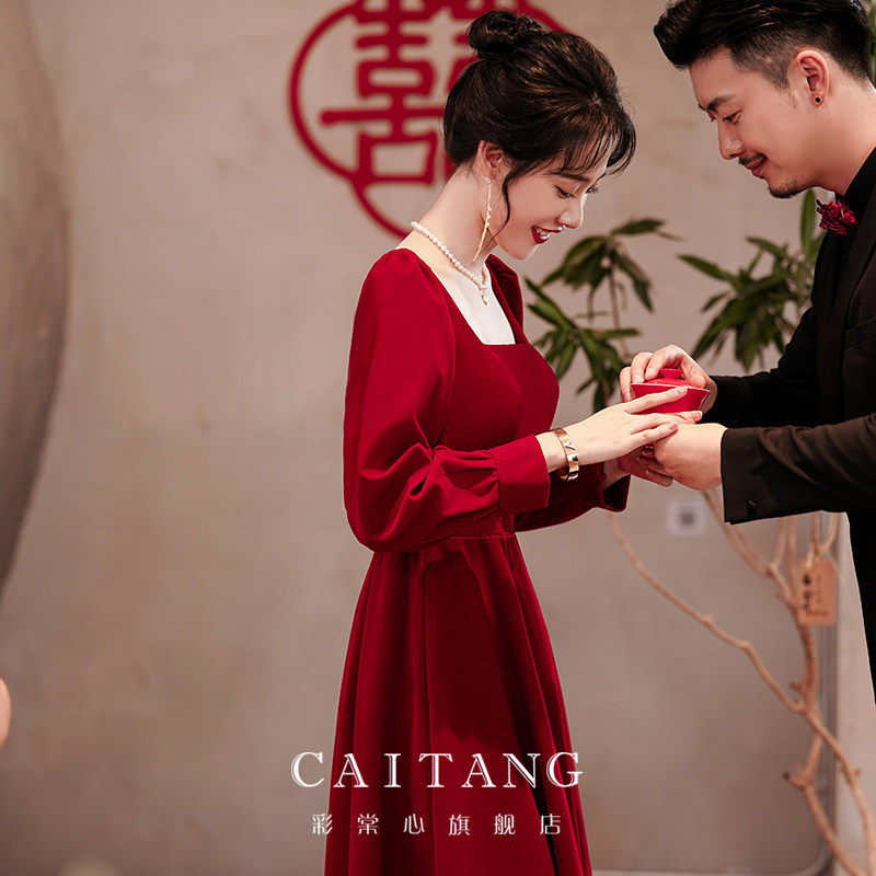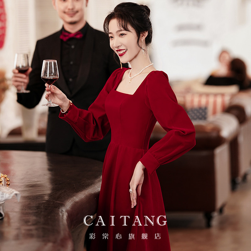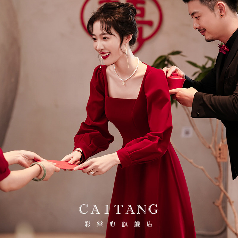 Wine red toast dress bride 2022 winter new engagement long-sleeved back to the door dress can usually be worn female high-end