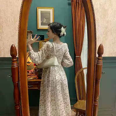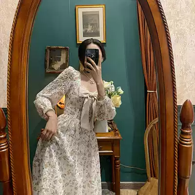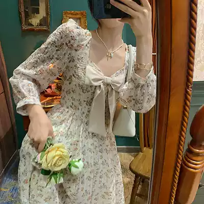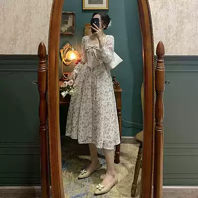 Korean version of gentle floral bow dress women Autumn New chic art feel waist long skirt tide