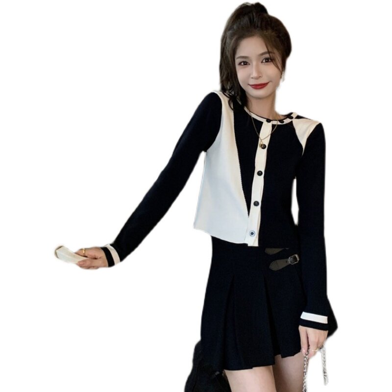 Autumn thin section chic color-blocking long-sleeved knitted T-shirt women's loose short section slimming all-match small cardigan top