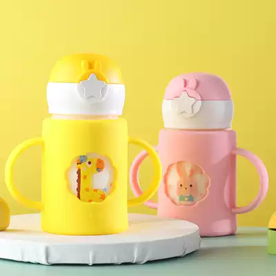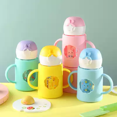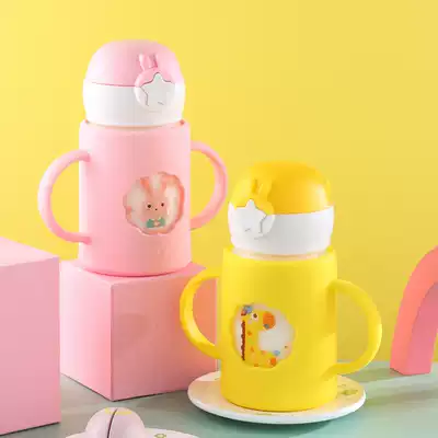 Children's Milk Cup with scale double handle anti-drop milk powder special can microwave baby drinking milk glass suction tube Cup