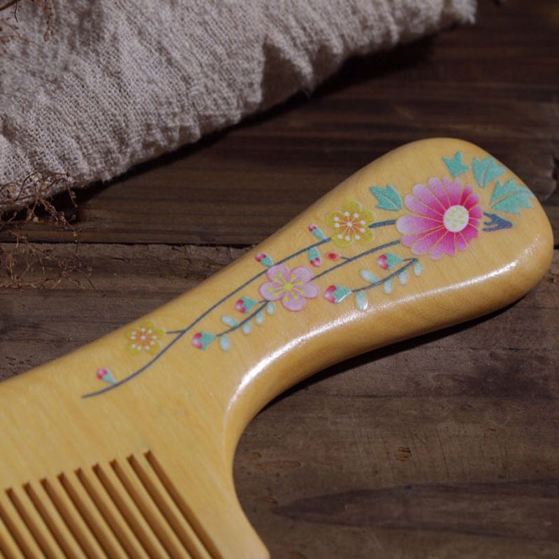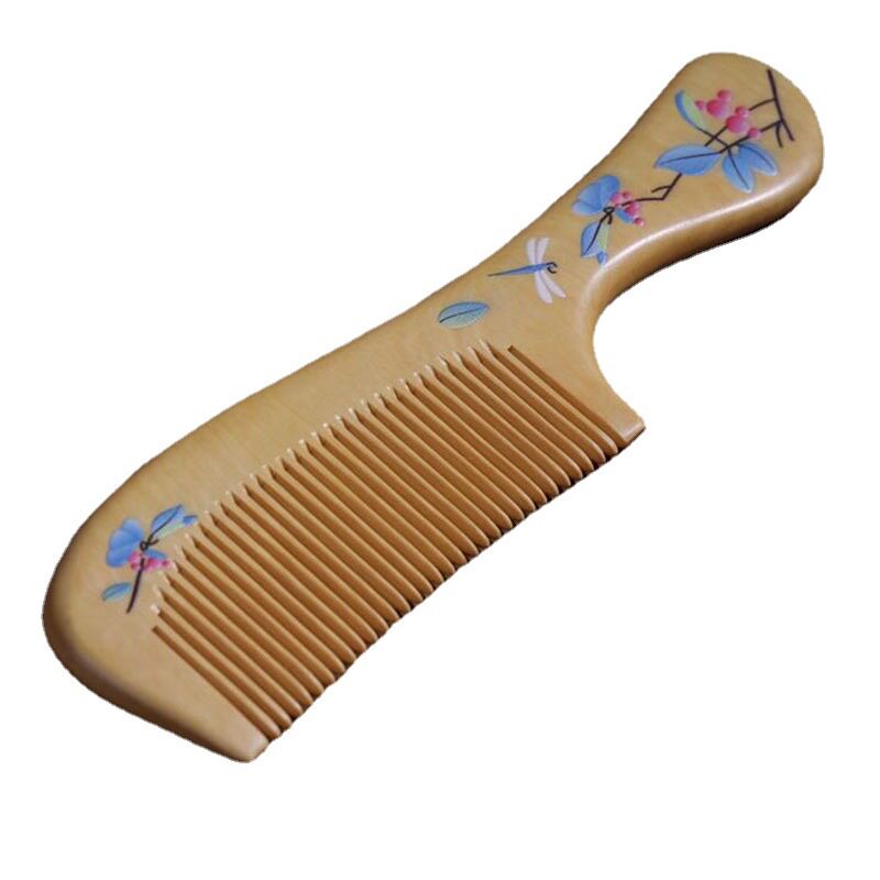 Yellow Yang wood comb painted lacquer art comb home antistatic portable comb bag comb wide teeth long hair massage lettering