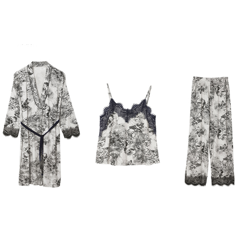 Water Ink Flowers Bird Painting ~ Guochao Small Sexy Harnesses Sleeping Clothes Lady Spring Autumn Long Sleeve Sleeping Robe Modale Three Suits