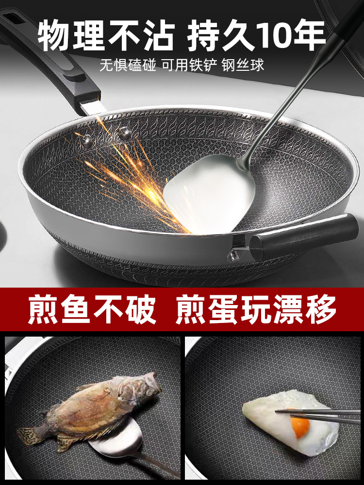 Double gun 316 stainless steel non-stick pan frying pan household flat-bottomed cooking pan less fume gas stove induction cooker special