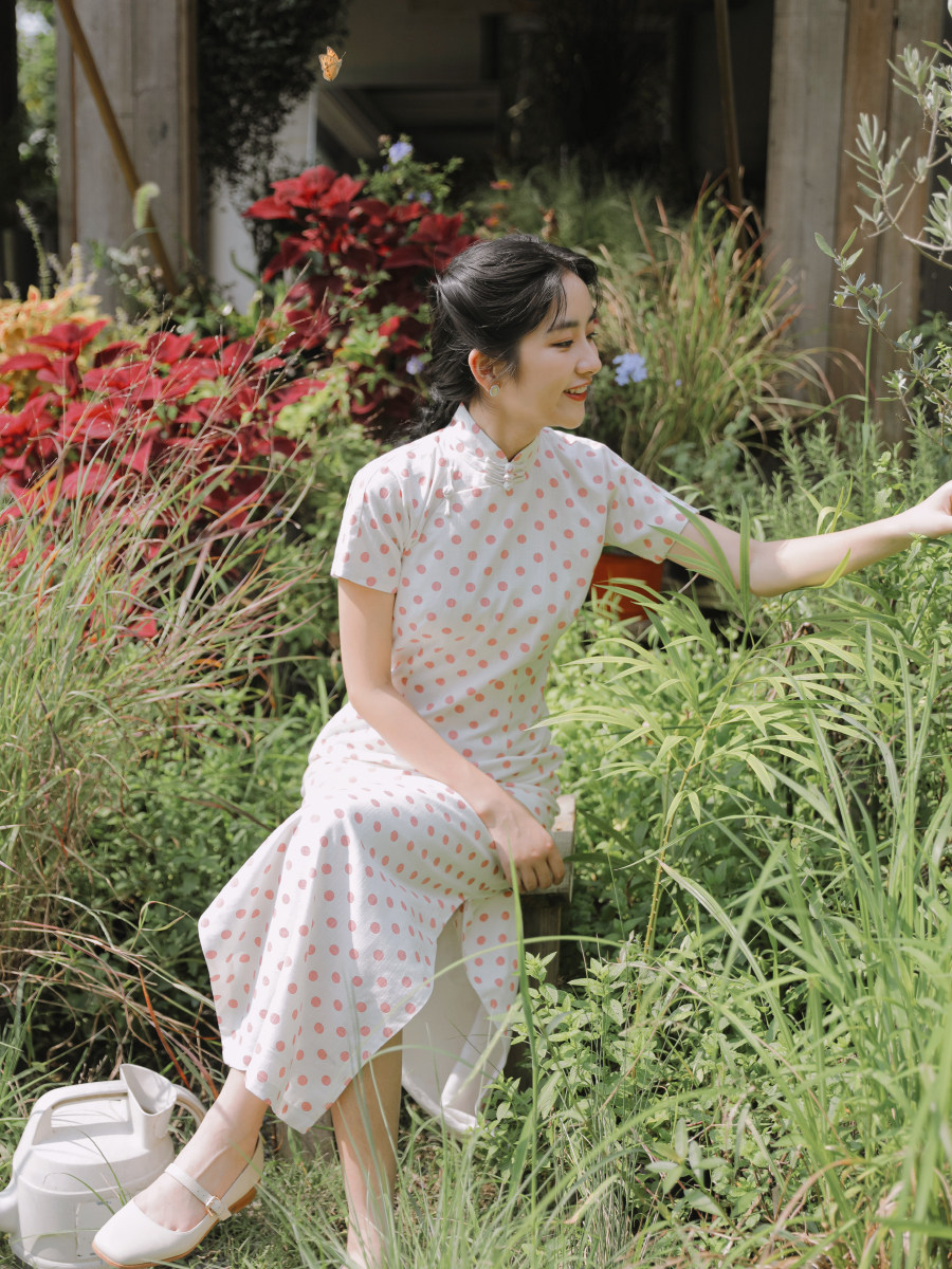 Mo Mo Teachers' Day Autumn New Short Sleeve Side Zipper Long Edition Daily Wave Point Linen Cheongsam Peach and Plum