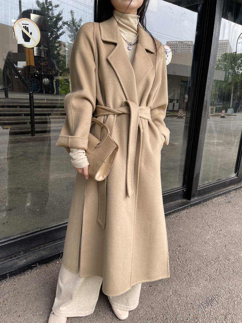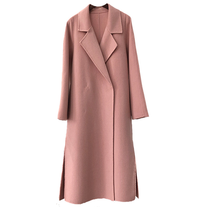 Pink Double Face Cashmere Big Coat Woman Mid 2021 New Korean version Side open fork with small fur coats women