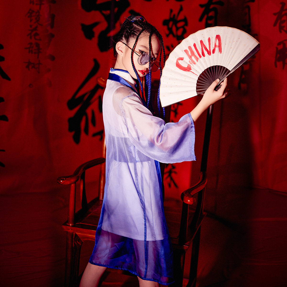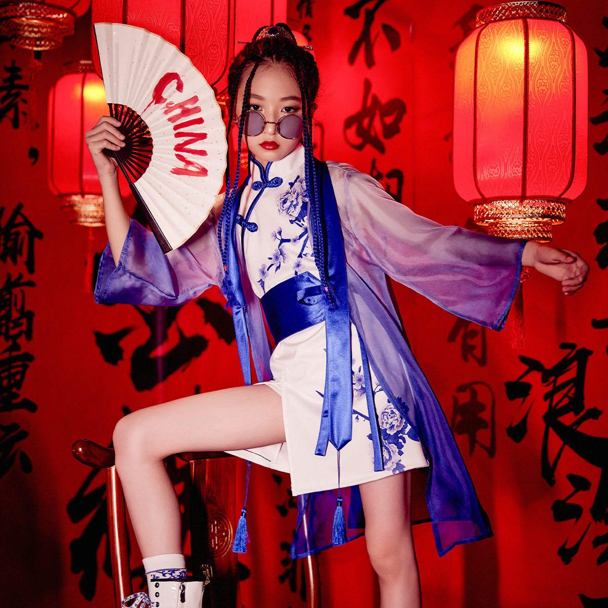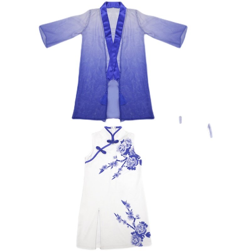 Boys and girls catwalk models catwalk costumes national tide blue and white porcelain cheongsam Chinese style children's ancient style costumes