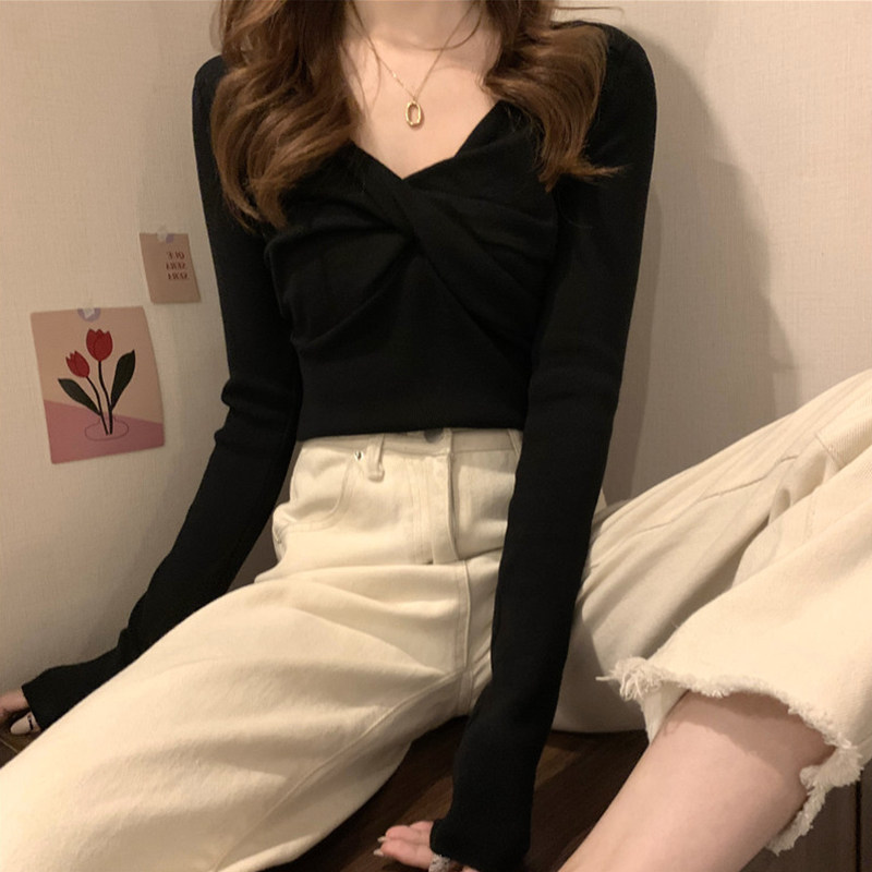 Wine red autumn knitted bottoming shirt female design sense niche long sleeves with V-neck autumn and winter chic cross top
