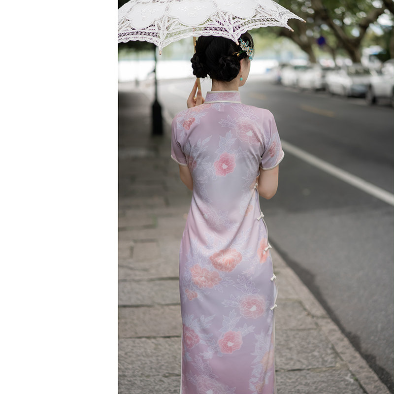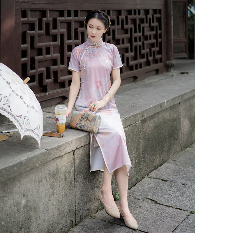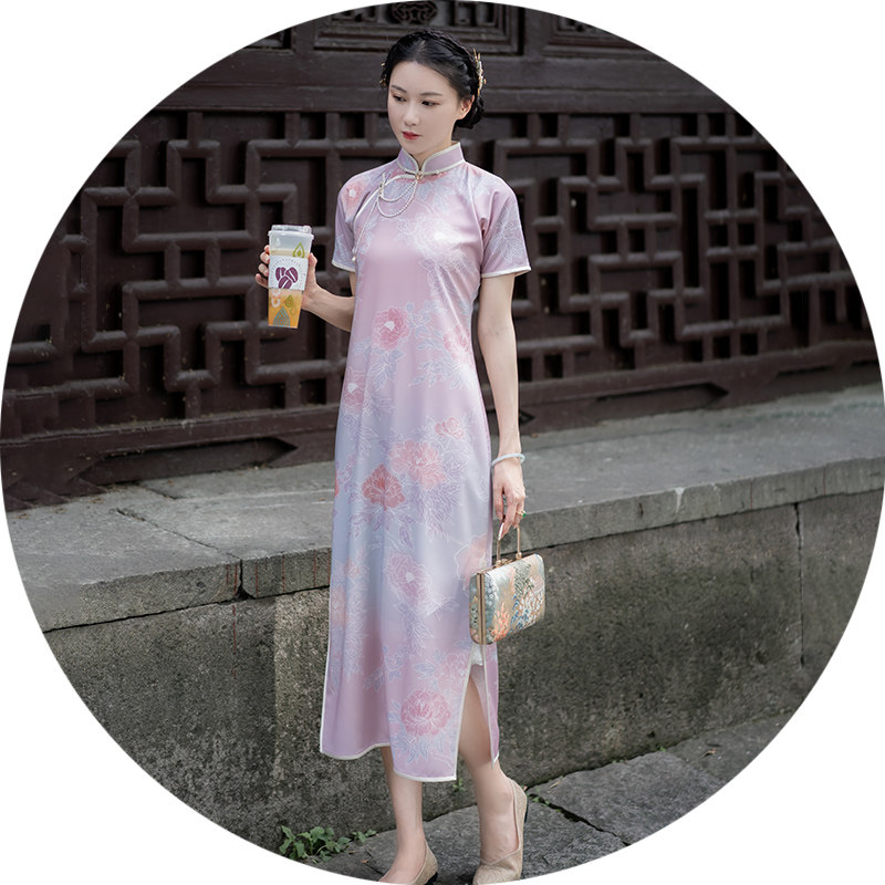 Xiaogongzi) Fang Fei) retro Republic of China style new short-sleeved slim fit waist was thin and long version of the cheongsam skirt full open