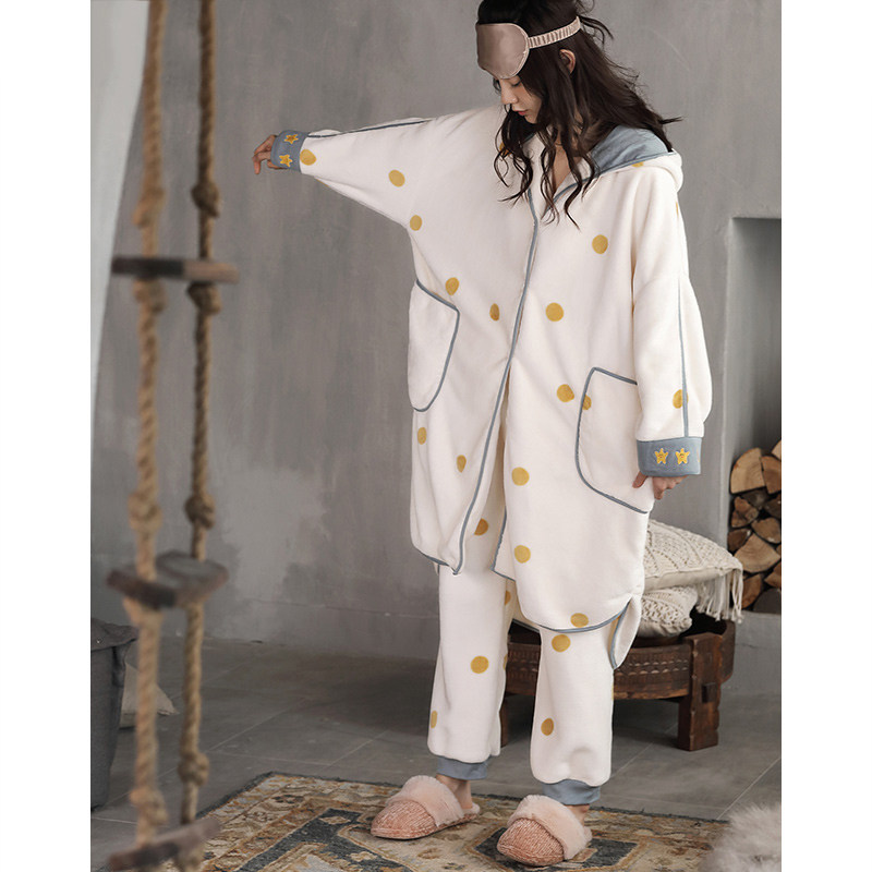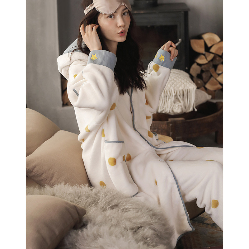 Coral Suede Pajamas Woman Autumn winter paragraph Thickened Flannel Velvet Long Version Sleeping Robe Suit can be worn outside the home or in the home