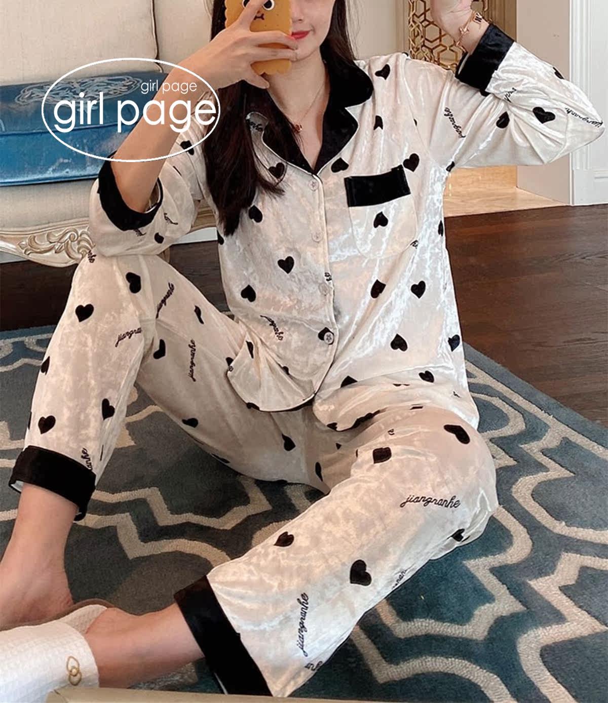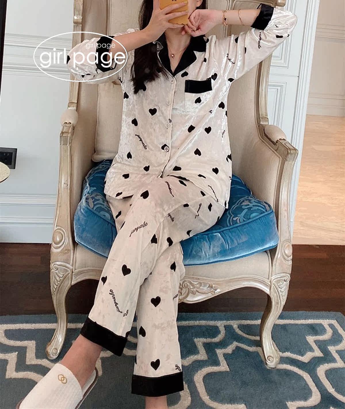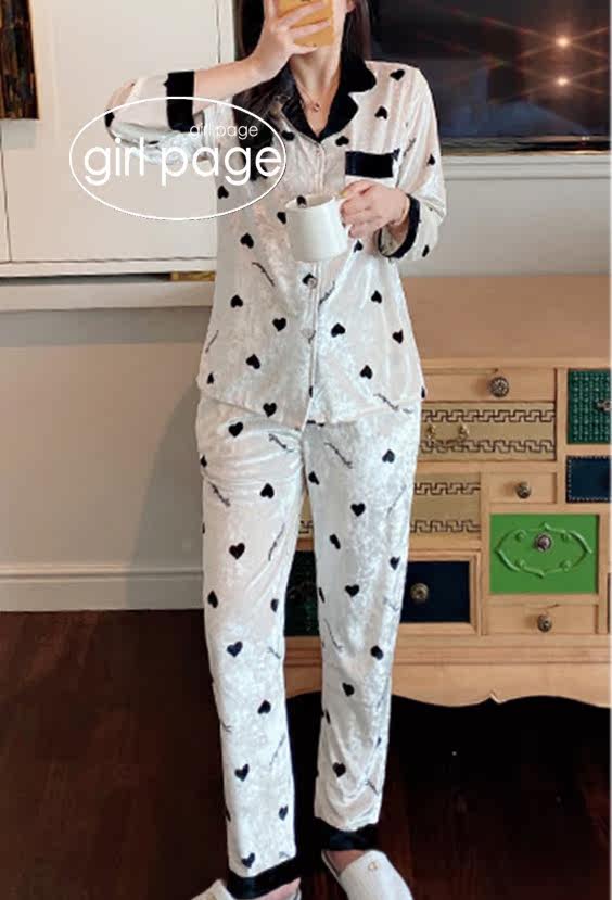 Japanese GP Peach Hearts Cardiovert Pyjamas Woman Autumn Winter Gold Drill Suede Sweet and long sleeve turnover home for two sets