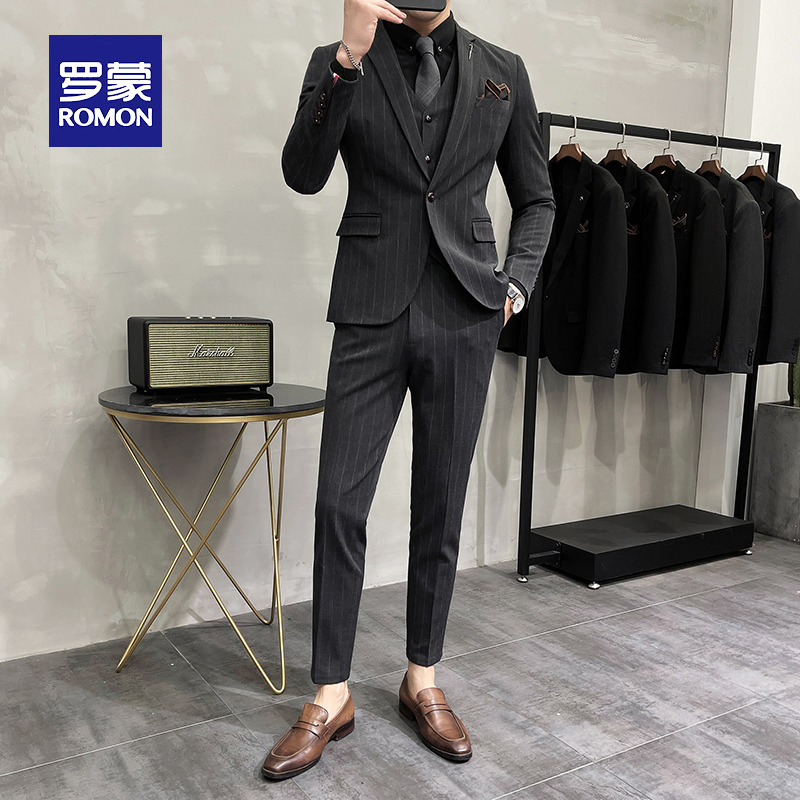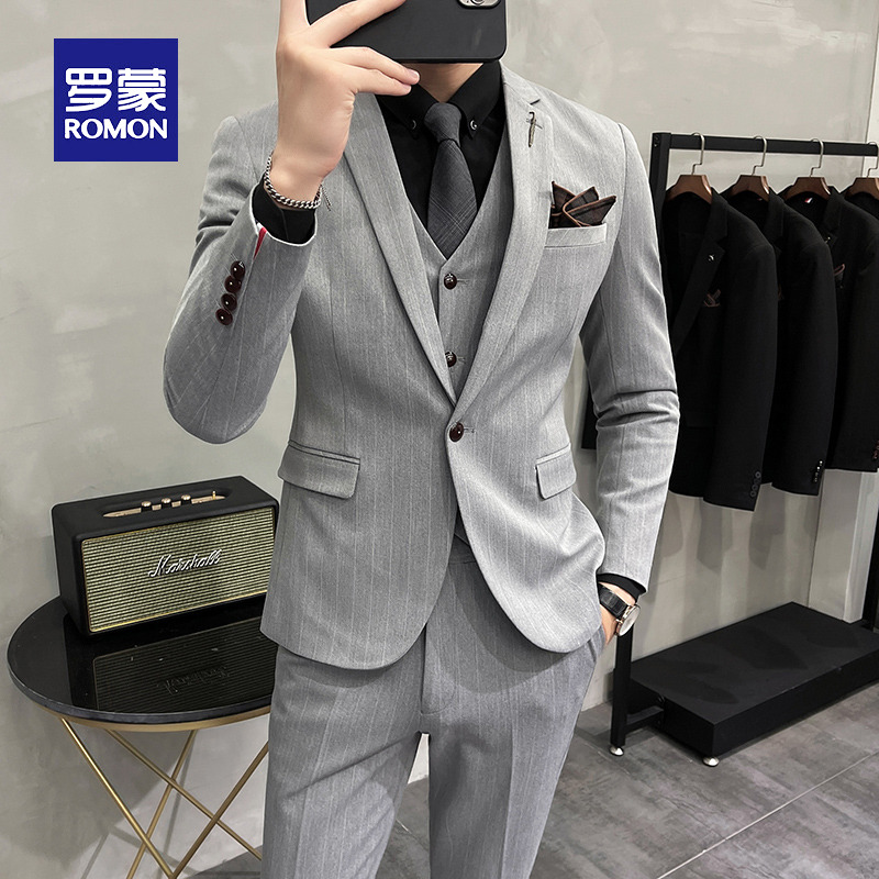 Romon Suit Suit Men's Striped Groom Wedding Dress Business Casual Work Suit Interview Professional Dress