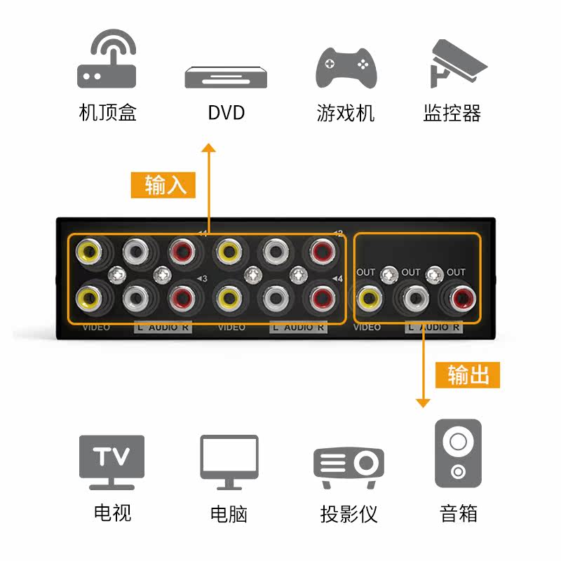 Audio and video AV switcher 4 in 1 out of three lotus red yellow white DVD pick up TV Maituwei moment MT-431AV