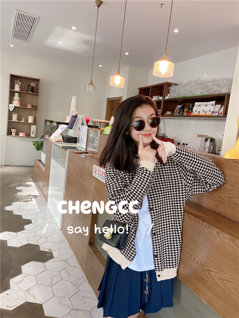 Year-end 50% off preppy houndstooth knitted cardigan, white bowknot shirt, navy blue embroidered doggy culottes