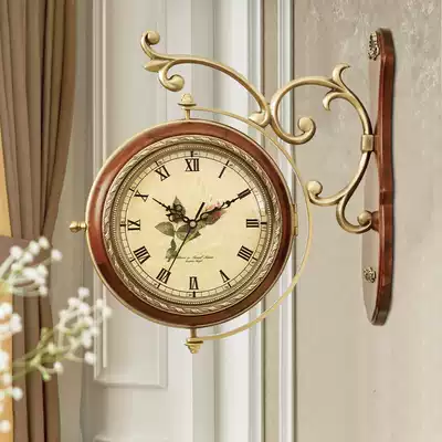 European-style solid wood pure brass double-sided wall clock American modern living room two-sided table Villa atmospheric solid wood quartz clock
