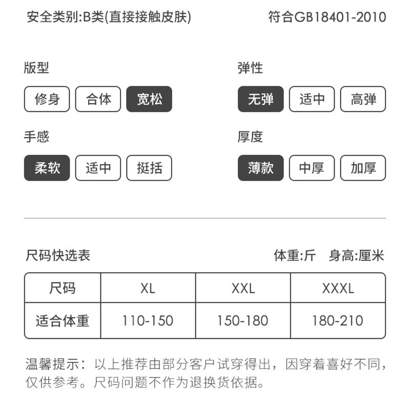 XL (Recommended Weight 110-150 catty) XXL (Recommended Weight 150-180 catty) XXXL (Recommended Weight 180-210 catties)