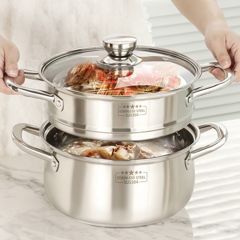 Stainless steel stockpot 304 Food grade thickened cooking pot with steam cage induction stove cooking pot household gas double-ear pan