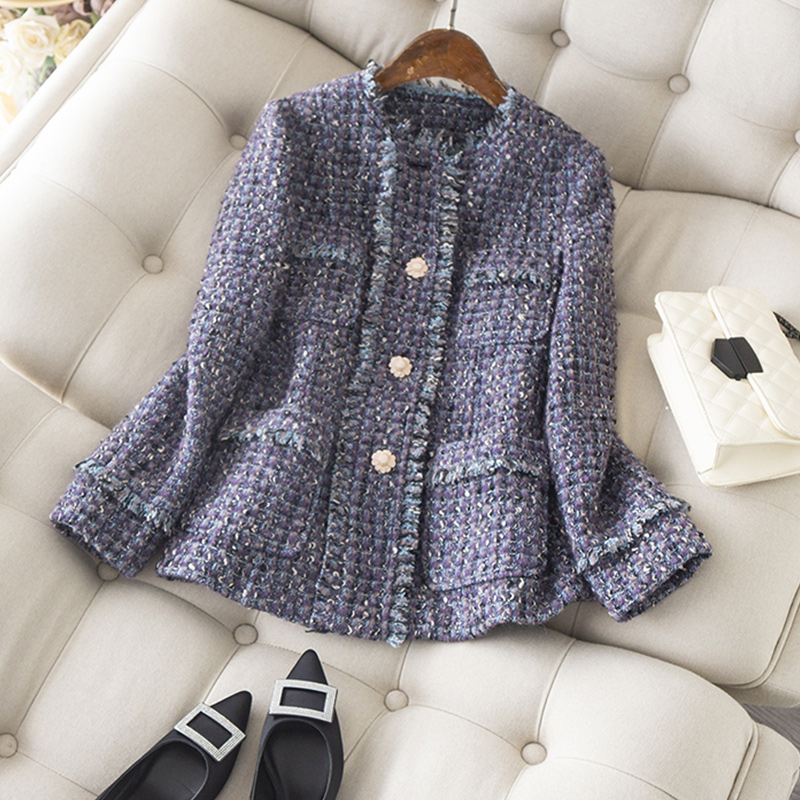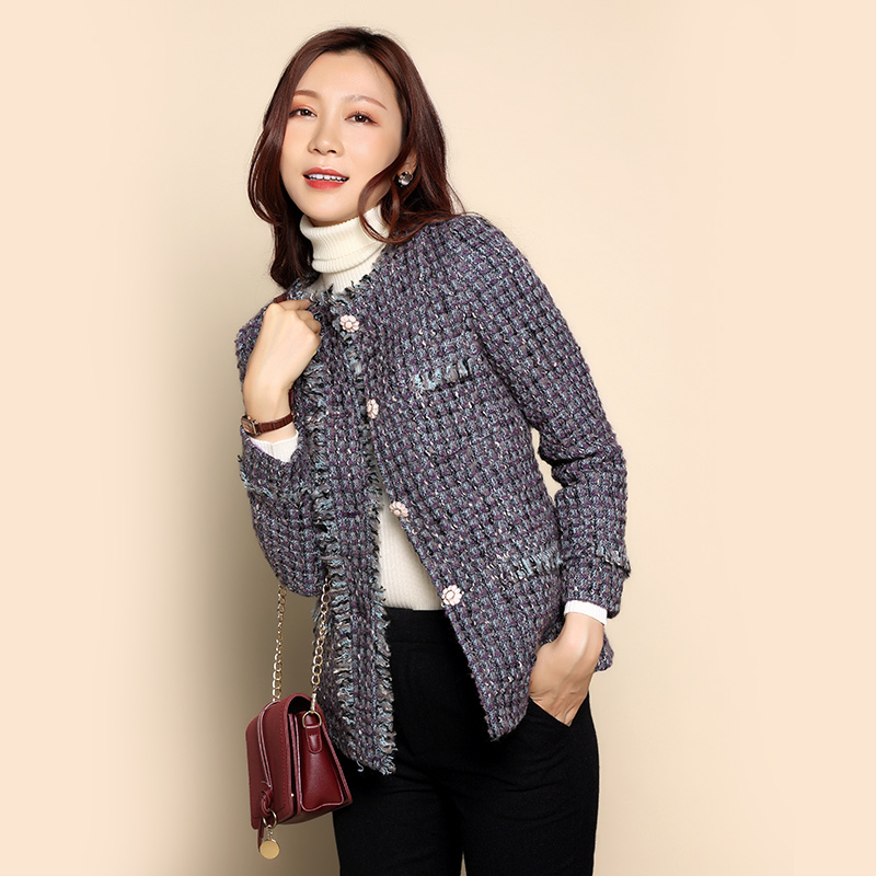 Velvet jasmine 2021 autumn new women's short coat light luxury smoky purple clip flower tweed wool fragrance coat