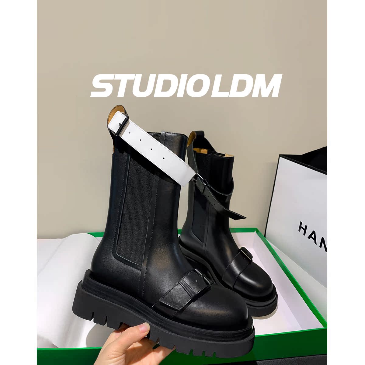 Lin Grand Strangeness Fetal Calf 2021 New Short Boots Woman Yingren Thick Bottom Middle Cylinder Smoke Pipe Chelsea Boots Woman Martin Boot