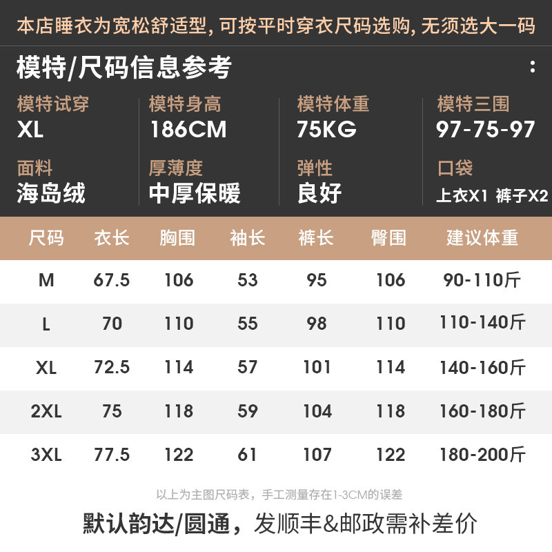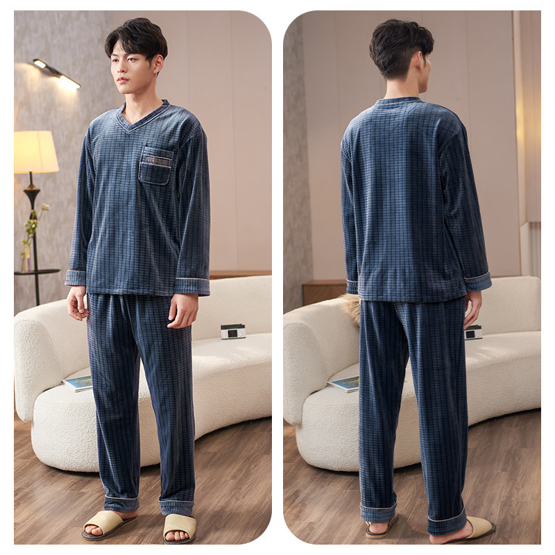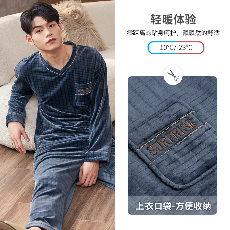 Island fleece pajamas men's winter thick long sleeves fall and winter thin warm coral fleece loungewear plus size set