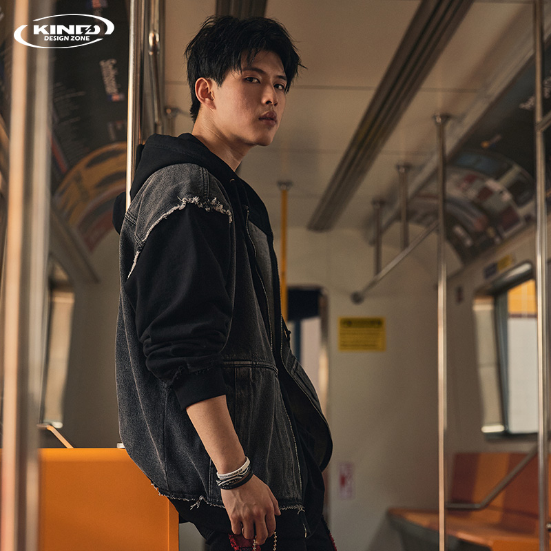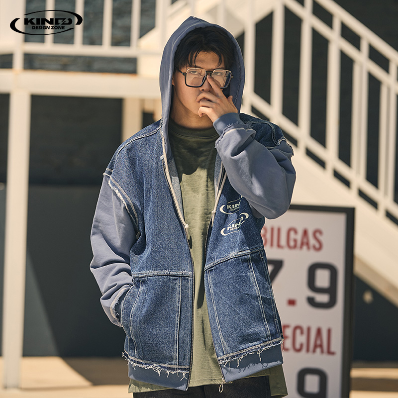 KKDZ Original design personality splicing wool edges Lianhood denim jacket boys spring and autumn loose fashion jacket