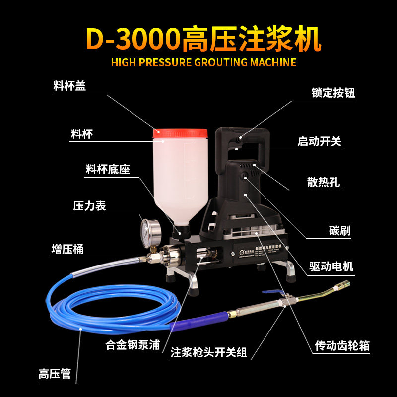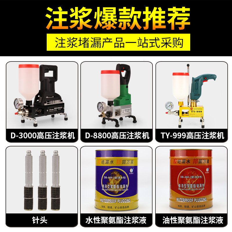D-3000 high-pressure grouting machine comes standard with D-3000 high-pressure grouting machine water-based package D-3000 high-pressure grouting machine oil-based package R-8800 high-pressure grouting machine comes standard with R-88