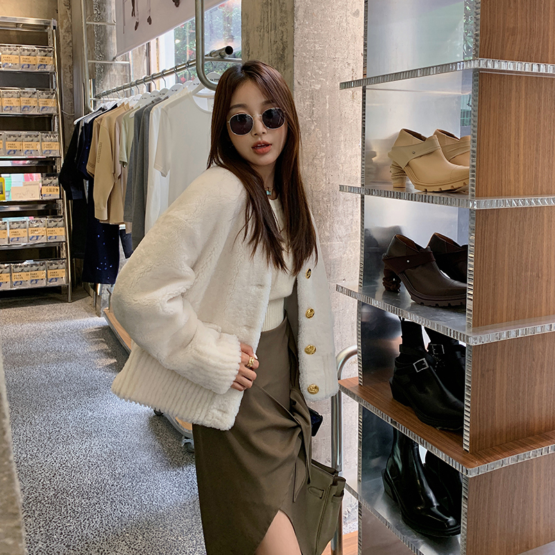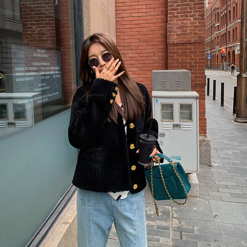 2021 new imported merino fur all-in-one women's lamb hair V-neck contrast color young fur short coat