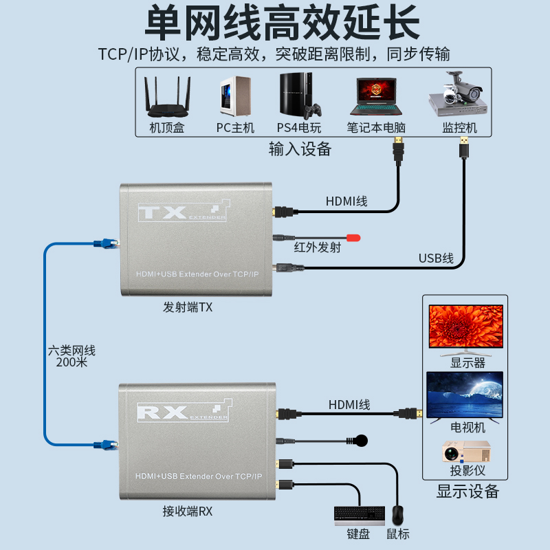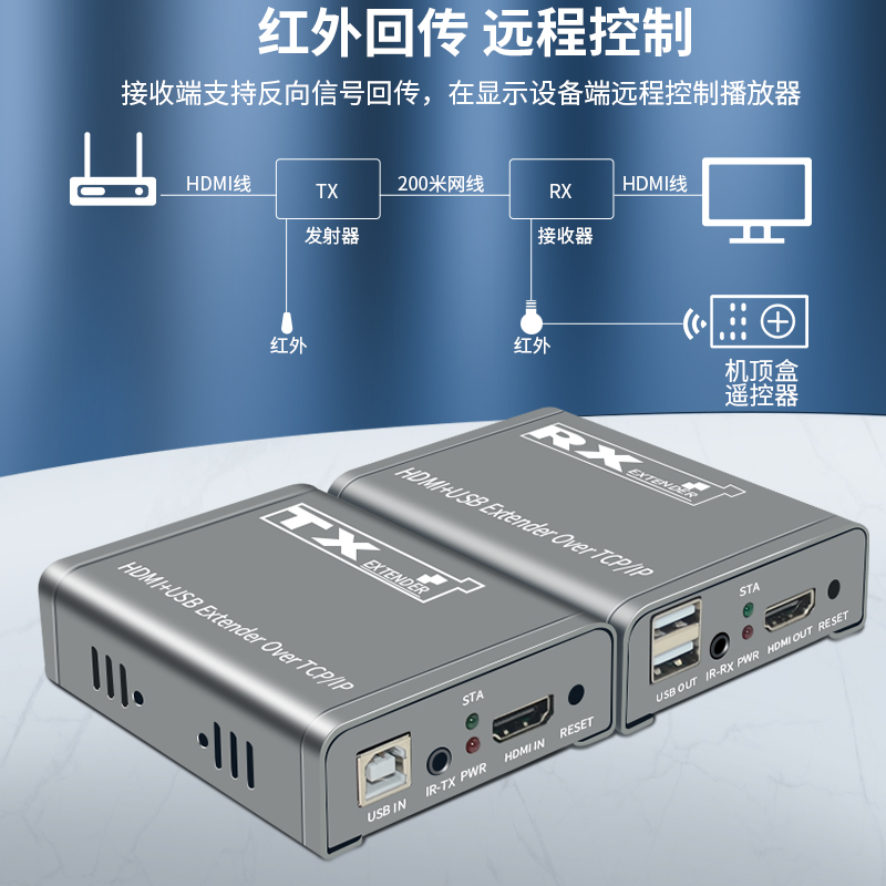 Engineering HDMI KVM network cable extender 200 meters network ip transmission amplifier to RJ45 network port with USB keyboard and mouse can pass through the switch one-to-many video sound synchronization 108