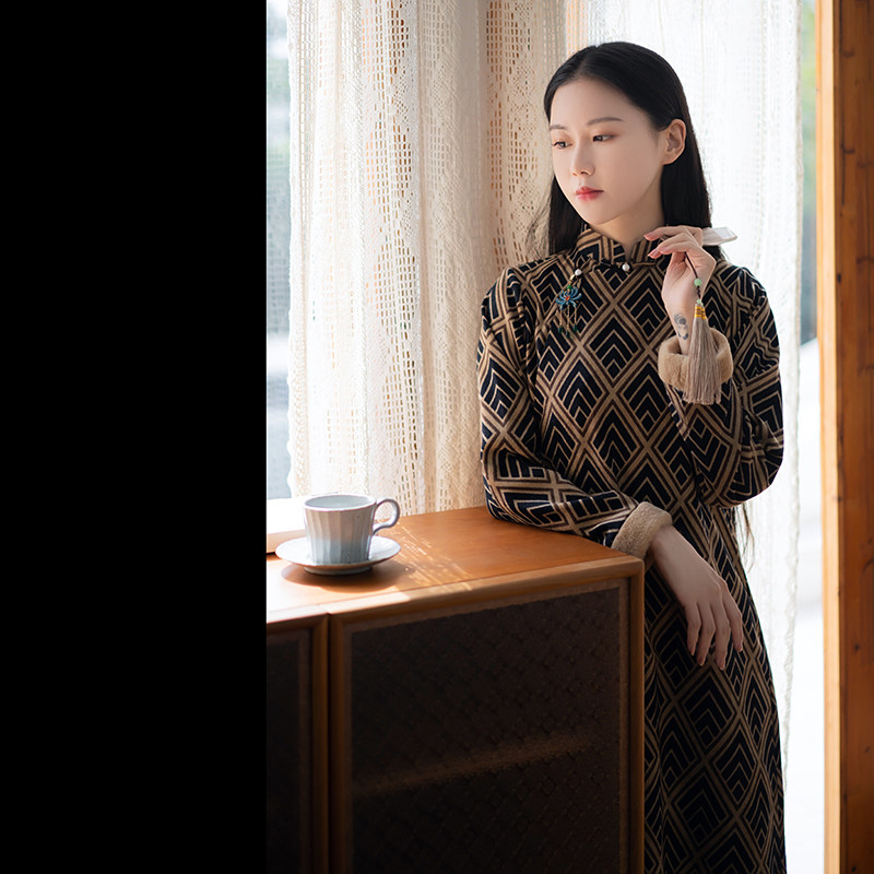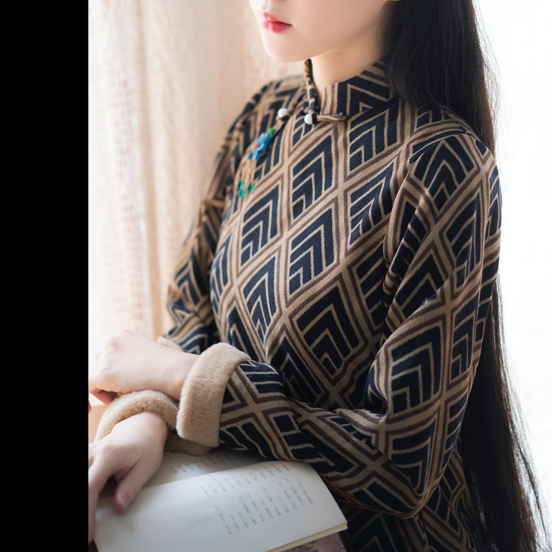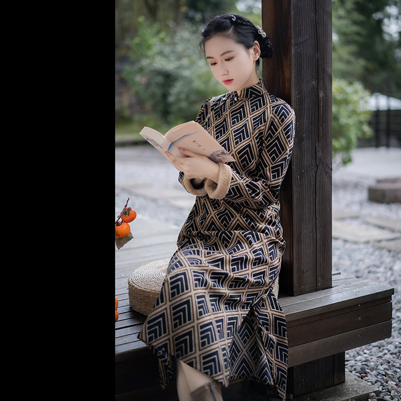 Xiaogongzi) Xijiangyue retro Republic of China style geometric pattern warm and comfortable corduroy cheongsam dress QP86