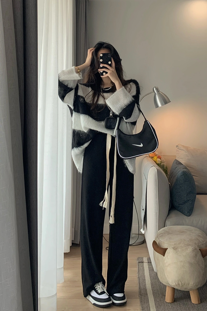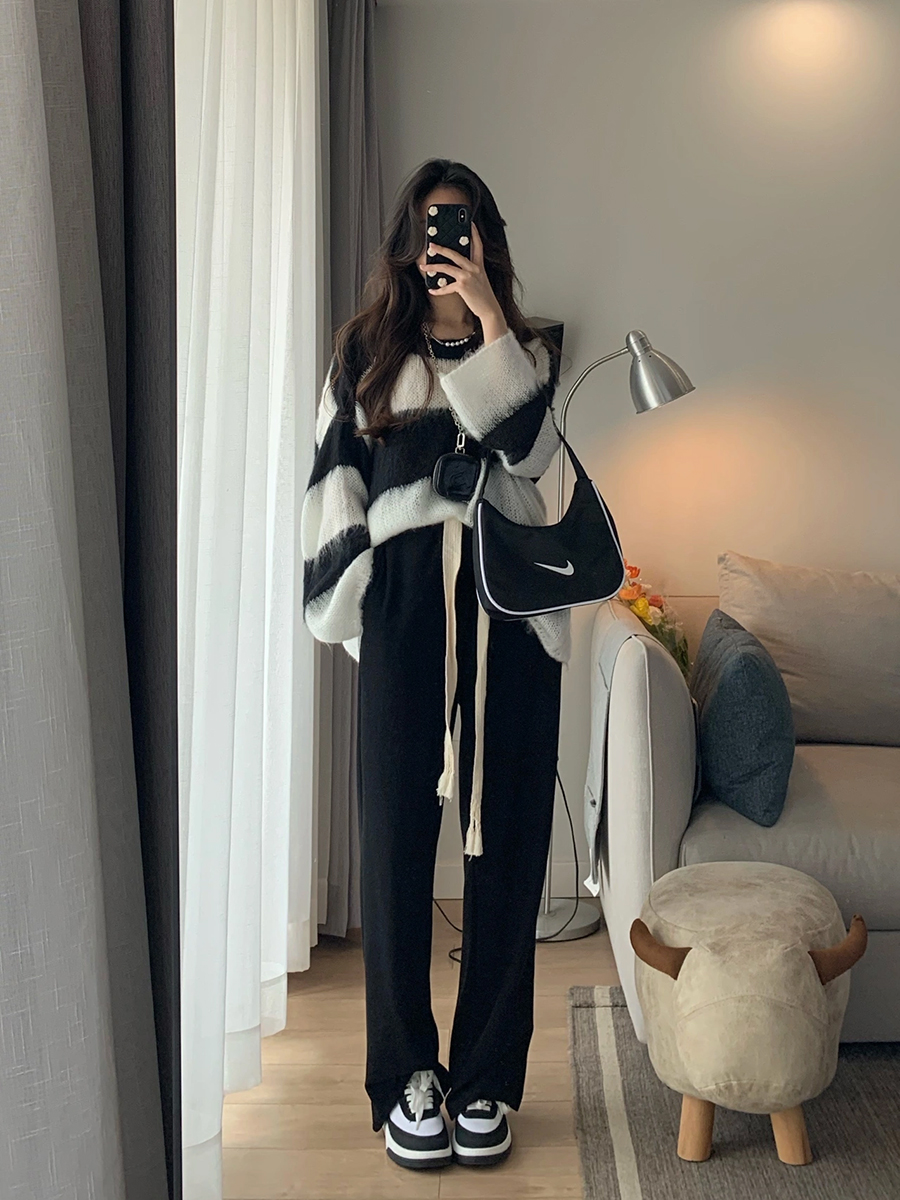 Black and white sweater broadlegged pants two sets of small scents ethos net red loose foreign sport casual fashion suit women