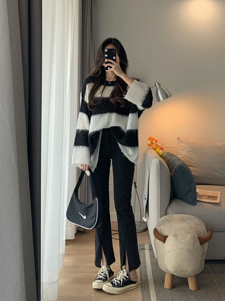 Black wide pants black and white striped sweater black wide pants black and white striped sweater