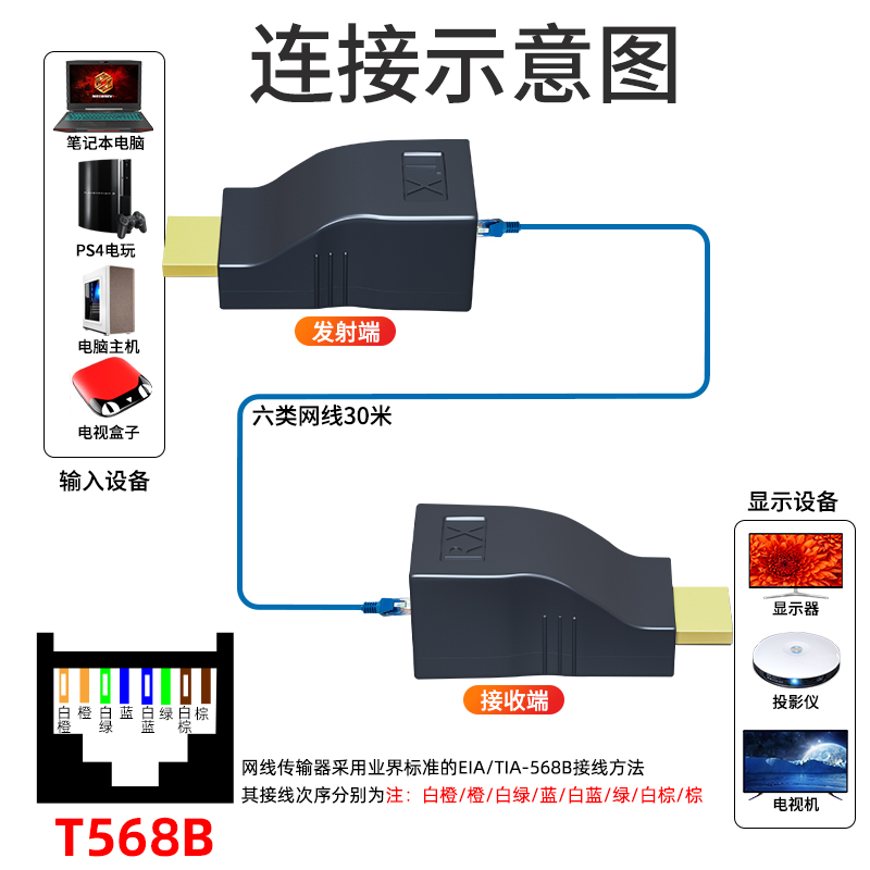 HDMI network extension transmitter 30 m passive to rj45 computer network signal amplifier HD transmission 1080p crystal head straight head extended signal hami