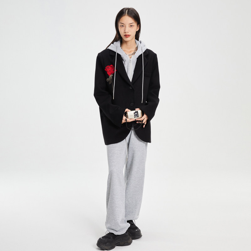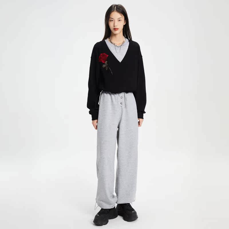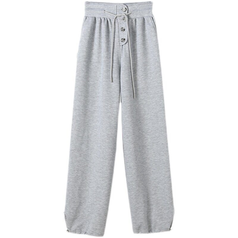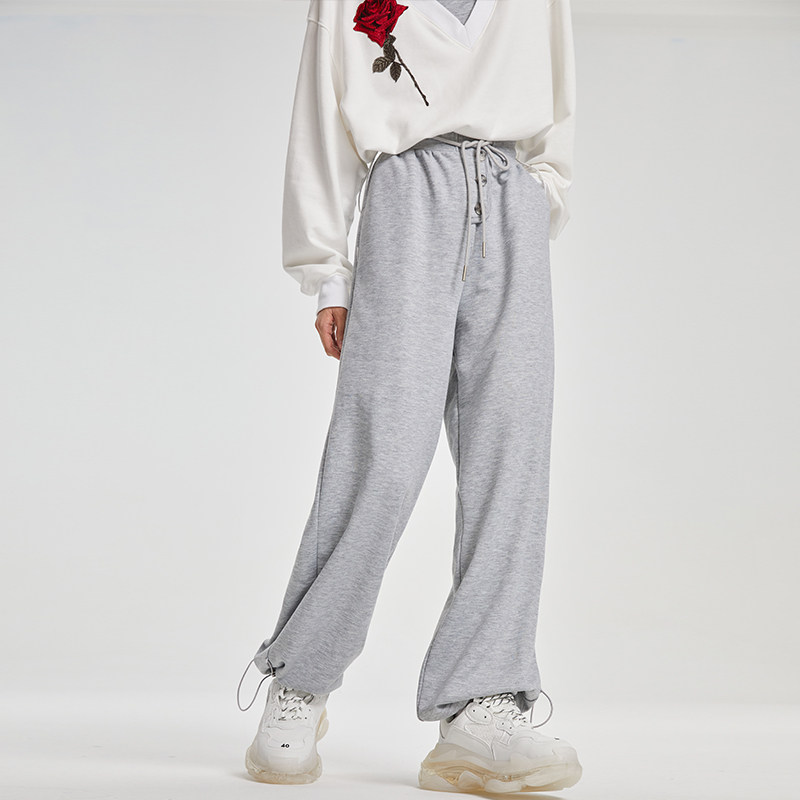 LUCKIET flower gray casual loose knitted long high waist vertical feet loose straight pants casual pants spring and autumn sports women