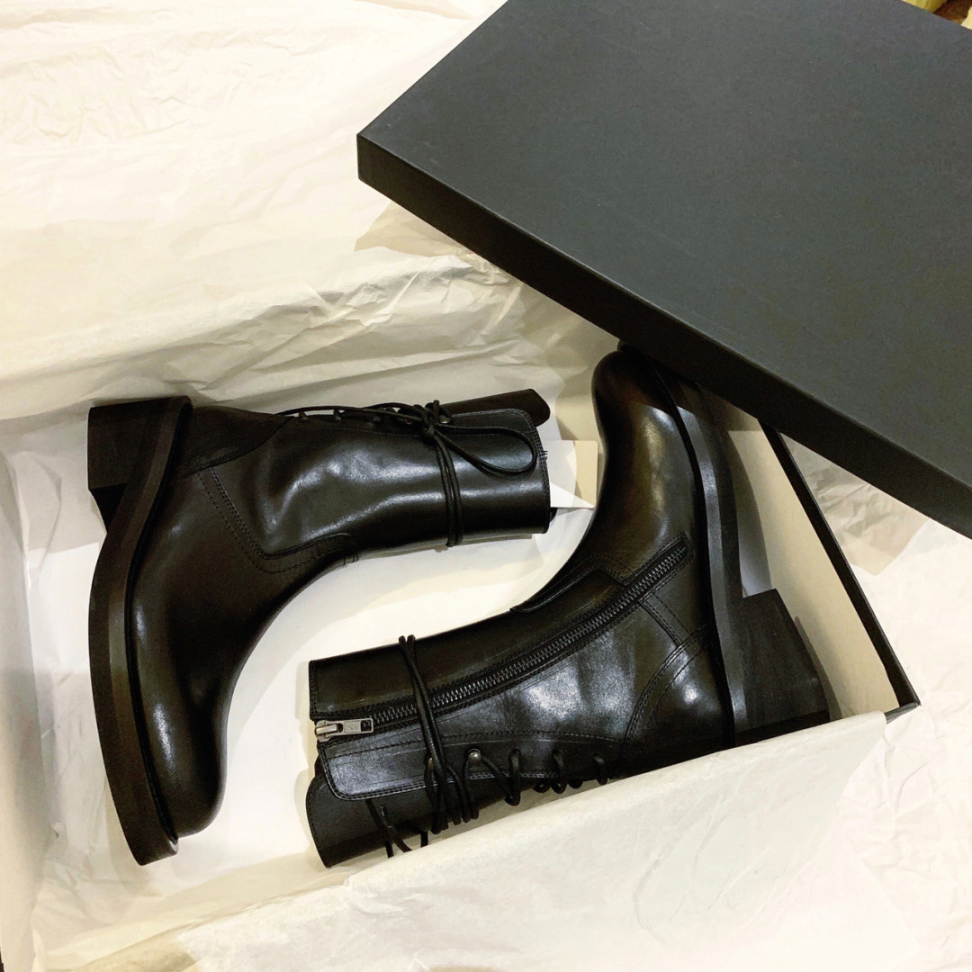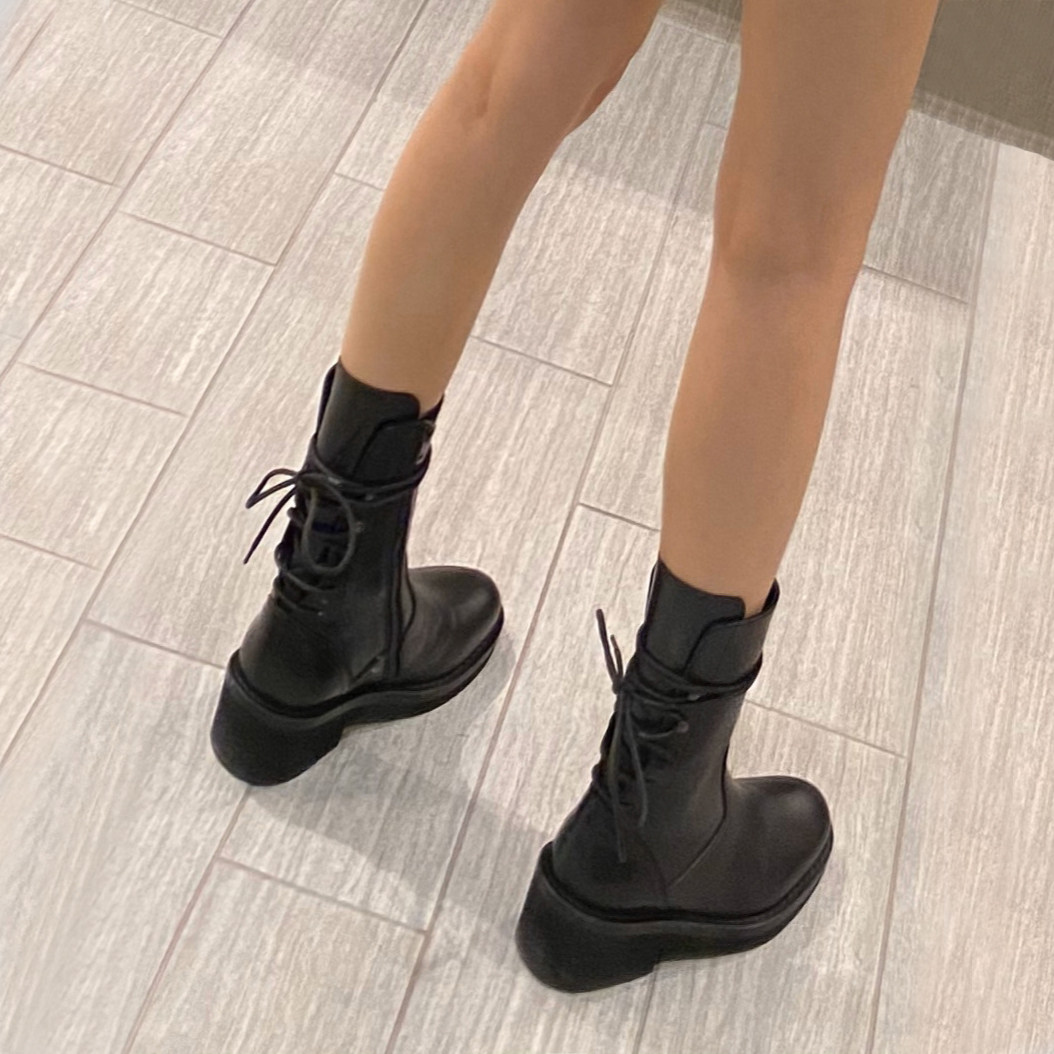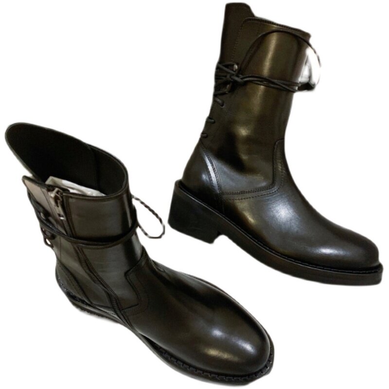 Top layer cowhide ~ rear lace leather thick heel Martin boots female British style black handsome mid-tube motorcycle boots short boots