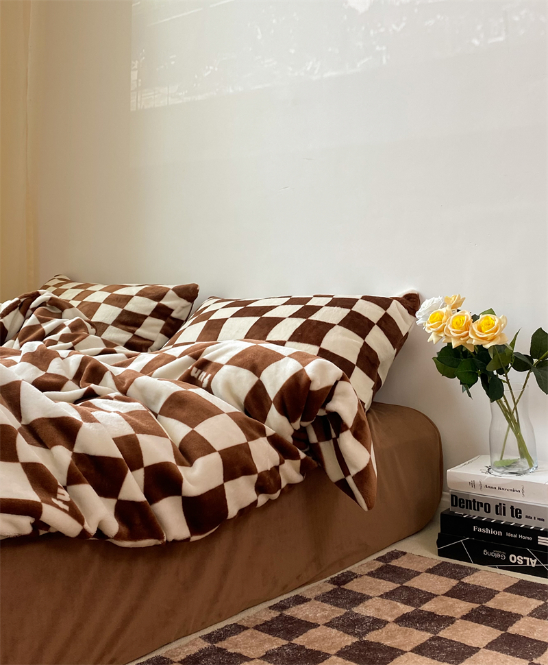 Moka Coffee Ins Trendy Chessboard Lattice Autumn Winter Warm Milk Suede Four Pieces Of Coral Suede Bed Linen Bed