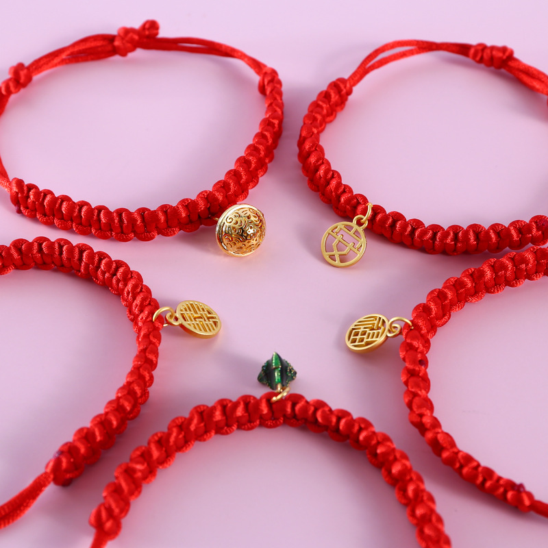 Red rope bell (sound) red rope bell (silent) red rope for a good fortune and red rope fu character red rope with Chinese character red rope gold bowl red rope gold bowl red rope footprints with red rope