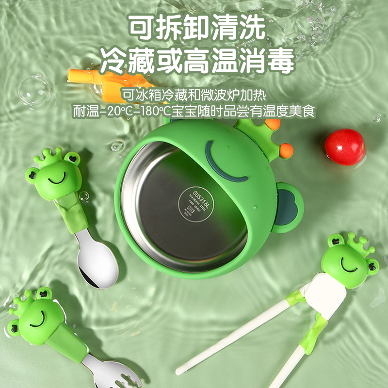 Food grade silicone material 316 stainless steel liner Crown frog Suction cup Suction straw Crown frog Spoon Fork set Suction cup Suction straw Crown frog Stainless steel liner Suction cup Suction